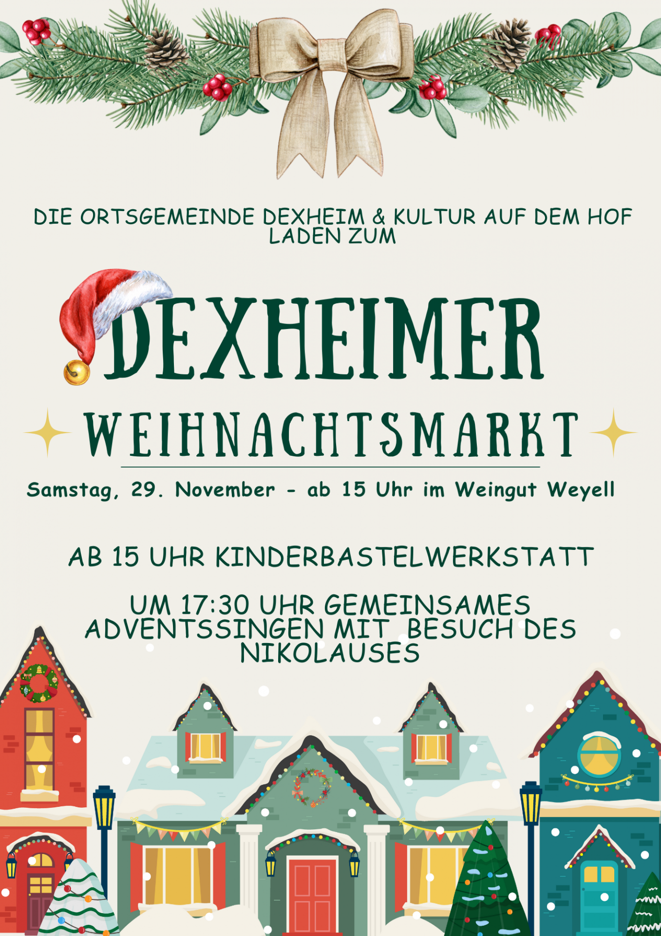 Am Samstag, den 29. November, laden die Ortsgemeinde Dexheim und Kultur auf dem Hof herzlich zum traditionellen Weihnachtsmarkt im Weingut Weyell ein. Ab 15:00 Uhr erwartet Sie ein stimmungsvoller Einstieg in die Adventszeit mit Vereinen und Gruppen aus Dexheim. Diese sorgen für ein vielfältiges Angebot an Essen, Getränken und besonderen Kleinigkeiten zum Stöbern.